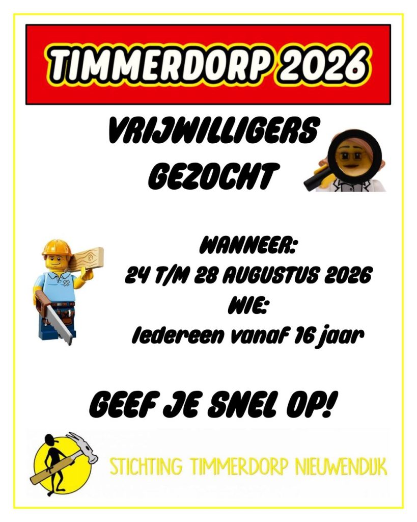 Ook dit jaar zijn we op zoek naar enthousiaste mensen die ons willen helpen tijdens Timmerdorp 2026.